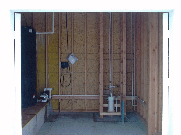 On the left is the water tank and pressure booster with horizontal pipe going to residence.